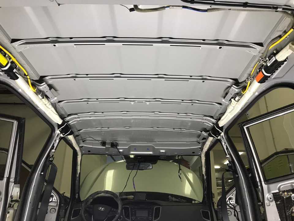 Начинаем шумоизоляцию с крыши. После демонтажа плафонов, солнцезащитных козырьков, накладок, над крышной полки, стоек, ручек, открывается огромная площадь из тонкостенного металла без какой либо заводской шумо и виброизоляции. Шумоизоляции крыши обязательна, т.к. это в среднем 1,5-2 метра тонкостенного металла, который над головами водителя и пассажиров на ходу начинает вибрировать и издавать высокочастотный гул (наподобие динамика большого размера).