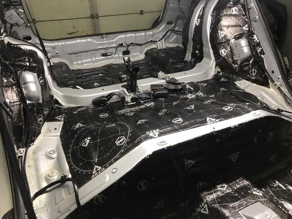 Вибродемпфирование арок и пола мы делаем более толстым и эффективным материалом Aero+. Это очень важно, поскольку только так можно погасить мощные вибрации. Материал самым тщательным образом прикатывается, т.к. только в этом случае шумоизоляция будет эффективной.