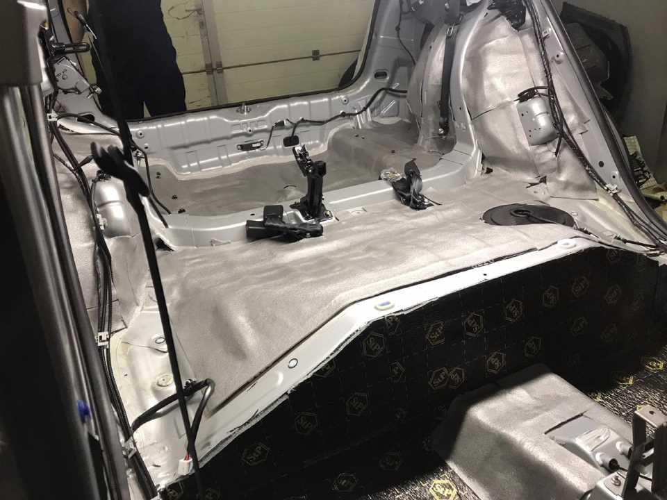 Теперь выносим из салона и багажника абсолютно всё: сидения, консоль, обшивки, ковры. Теперь мы можем наблюдать голый металл пола и арок. Это самая вибронагруженная часть в любом автомобиле. Поэтому все работы нужно сделать особо тщательно и с использованием подходящих материалов.