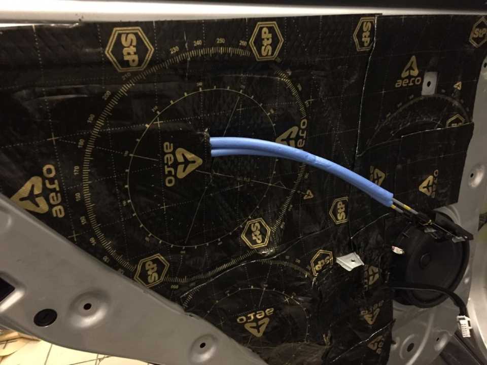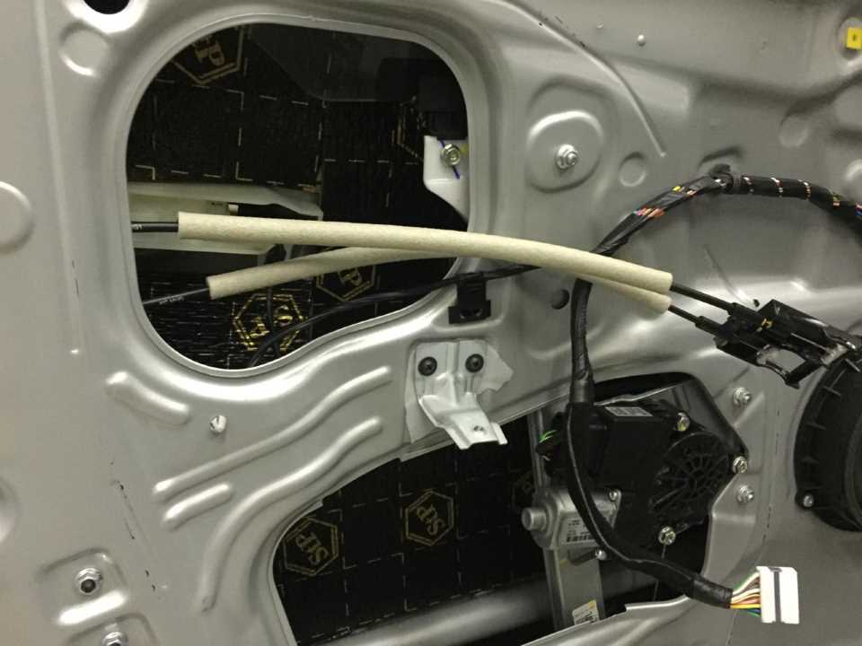Для окончательного поглощения шума , который исходит из дверей, мы наносим на карты дверей эффективный шумопоглотитель. Этот материал на основе вязкоэластичного вспененного полиуретана отлично поглощает звук. За счет своей толщины мы сможем плотно установить дверную карту на свое место. Это позволит на 100% избавиться от скрипов и «сверчков». По просьбе Владельца мы дополнительно смонтировали на периметр дверной карты противоскрипный материал Маделин.