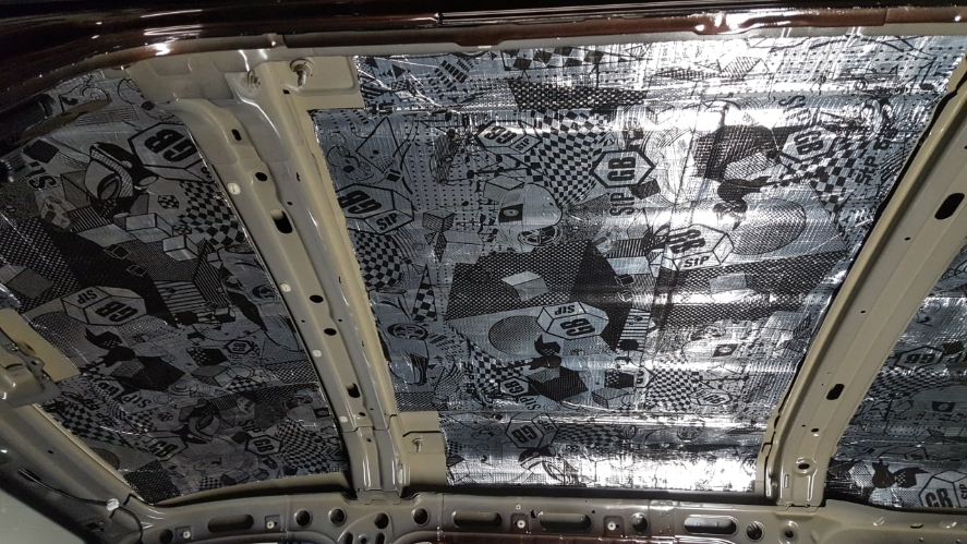 Металл крыши Lada Largus виброизолируем демпфером GB ,который необходимо качественно раскатать роликами, в противном случае эффекта не будет. Уже после такой обработки ,если по крыше постучать снаружи, крыша не гремит, а издает глухой звук.