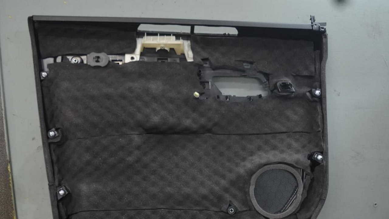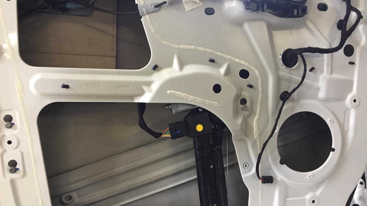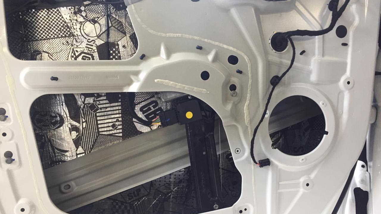 Для окончательного поглощения шума , который исходит из дверей, мы наносим на карты дверей эффективный шумопоглотитель. Этот материал на основе вязкоэластичного вспененного полиуретана отлично поглощает звук. За счет своей толщины мы сможем плотно установить дверную карту на свое место. Это позволит на 100% избавиться от скрипов и «сверчков». По просьбе Владельца мы дополнительно смонтировали на периметр дверной карты противоскрипный материал Маделин.