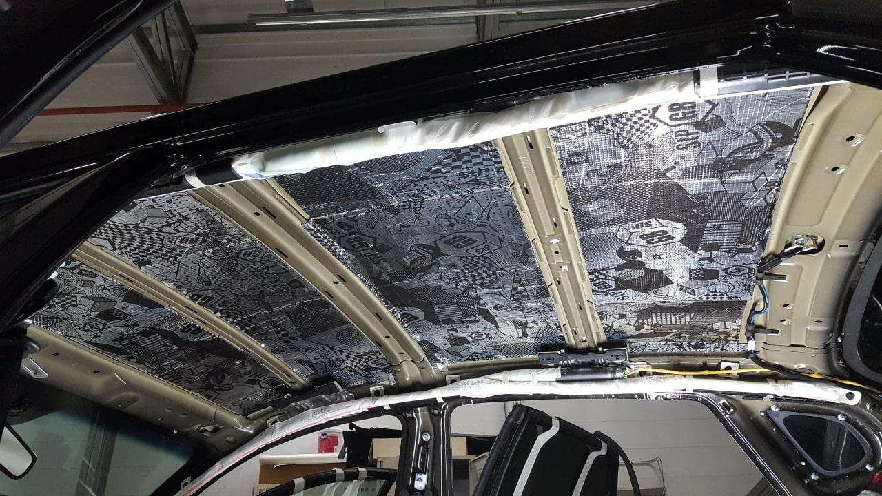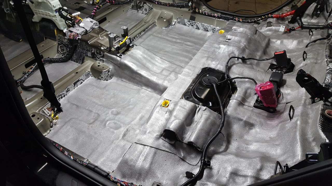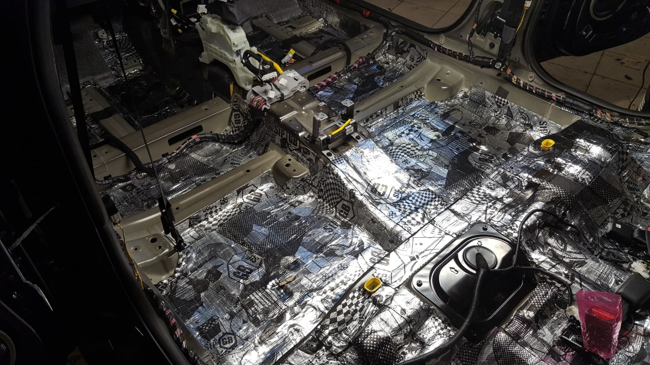 Вибродемпфирование арок и пола мы делаем более толстым и эффективным материалом GB. Это очень важно, поскольку только так можно погасить мощные вибрации . Материал самым тщательным образом прикатывается, т.к. только в этом случае шумоизоляция будет эффективной.