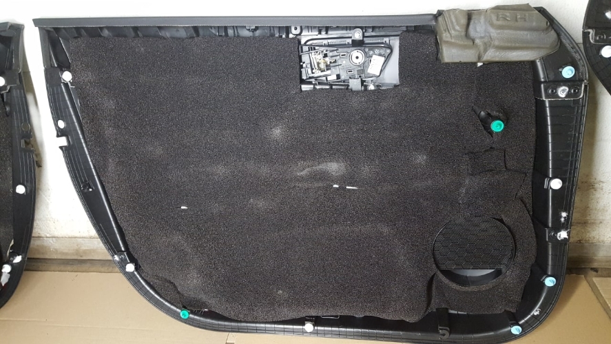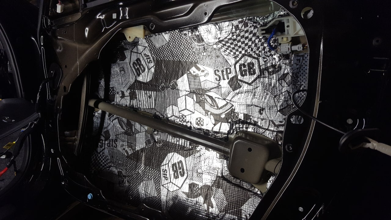 Для окончательного поглощения шума , который исходит из дверей, мы наносим на карты дверей Битопласт. Этот материал на основе вспененного полиуретана с битумной пропиткой отлично поглощает звук. За счет своей толщины мы сможем плотно установить дверную карту на свое место. Это позволит на 100% избавиться от скрипов и «сверчков». По просьбе Владельца мы дополнительно смонтировали на периметр дверной карты противоскрипный материал Маделин.